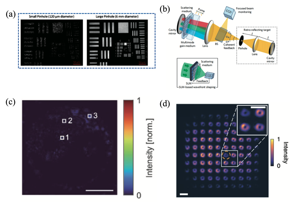 圖2 基于簡(jiǎn)并腔多模激光器的新型應(yīng)用。(a) 消散斑成像;(b) 波前整形;(c) 相干吸收;(d) 渦旋缺陷自愈